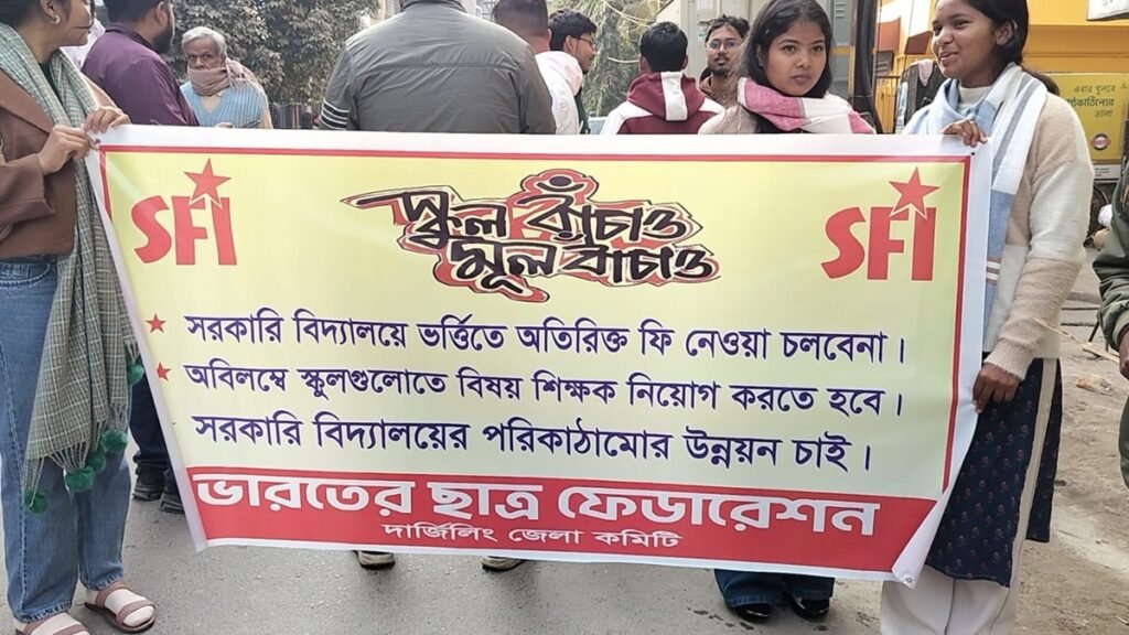 सरकारी विद्यालयहरूमा अतिरिक्त शुल्क असुली, शिक्षक अभाव तथा पूर्वाधारको दयनीय अवस्थाको आरोप लगाउँदै स्टुडेण्ट फेडेरेशन अफ इण्डिया (एसएफआई)ले विरोध प्रदर्शन गरेको छ। सोमवार सिलगढ़ी शहरमा एसएफआई दार्जीलिङ जिल्ला समितिको पहलमा विरोध जुलुस आयोजना गरियो। जुलुसले शहरका विभिन्न महत्त्वपूर्ण मार्ग परिक्रमा गर्दै अन्ततः डीआई कार्यालयअघि पुगेर समापन भयो।यससितै प्रदर्शनकारीहरूले विभिन्न मागहरू अघि सारे। तिनीहरूको मागअनुसार सरकारी […]